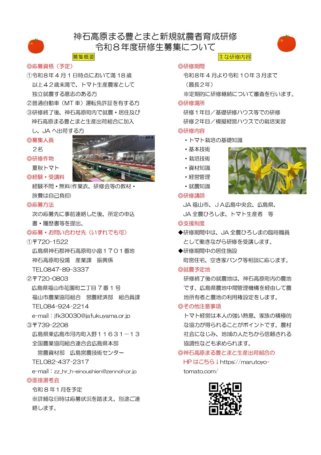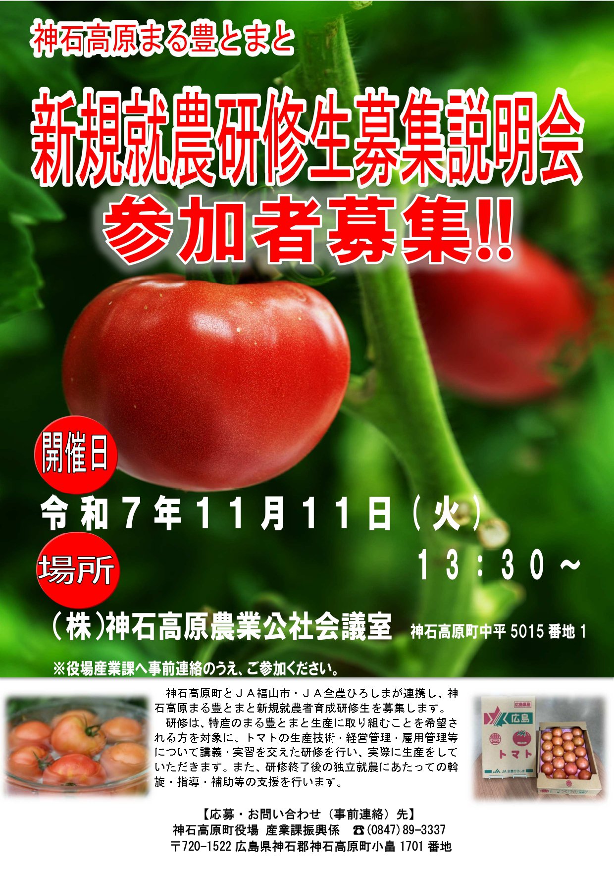 神石高原町では、特産のトマトの生産に取り組む方を対象に、トマトの生産技術・経営管理・雇用管理等について講義・実習を交えた研修生の募集を行います。また、研修終了後の就農、独立にあたっての斡旋・指導・補助等についても支援を行います。