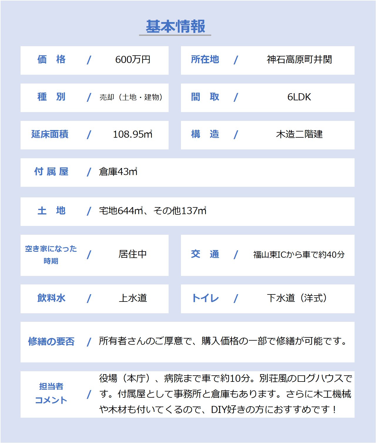 【所在地】広島県神石郡神石高原町井関 【種別】売却(土地及び建物)