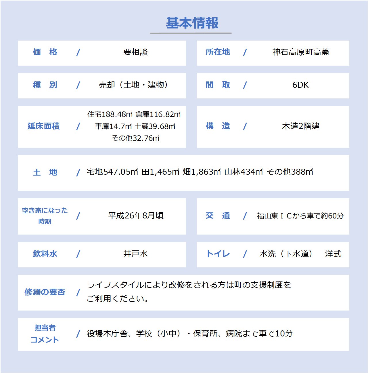 【所在地】広島県神石郡神石高原町高蓋 【種別】売却(土地及び建物)
