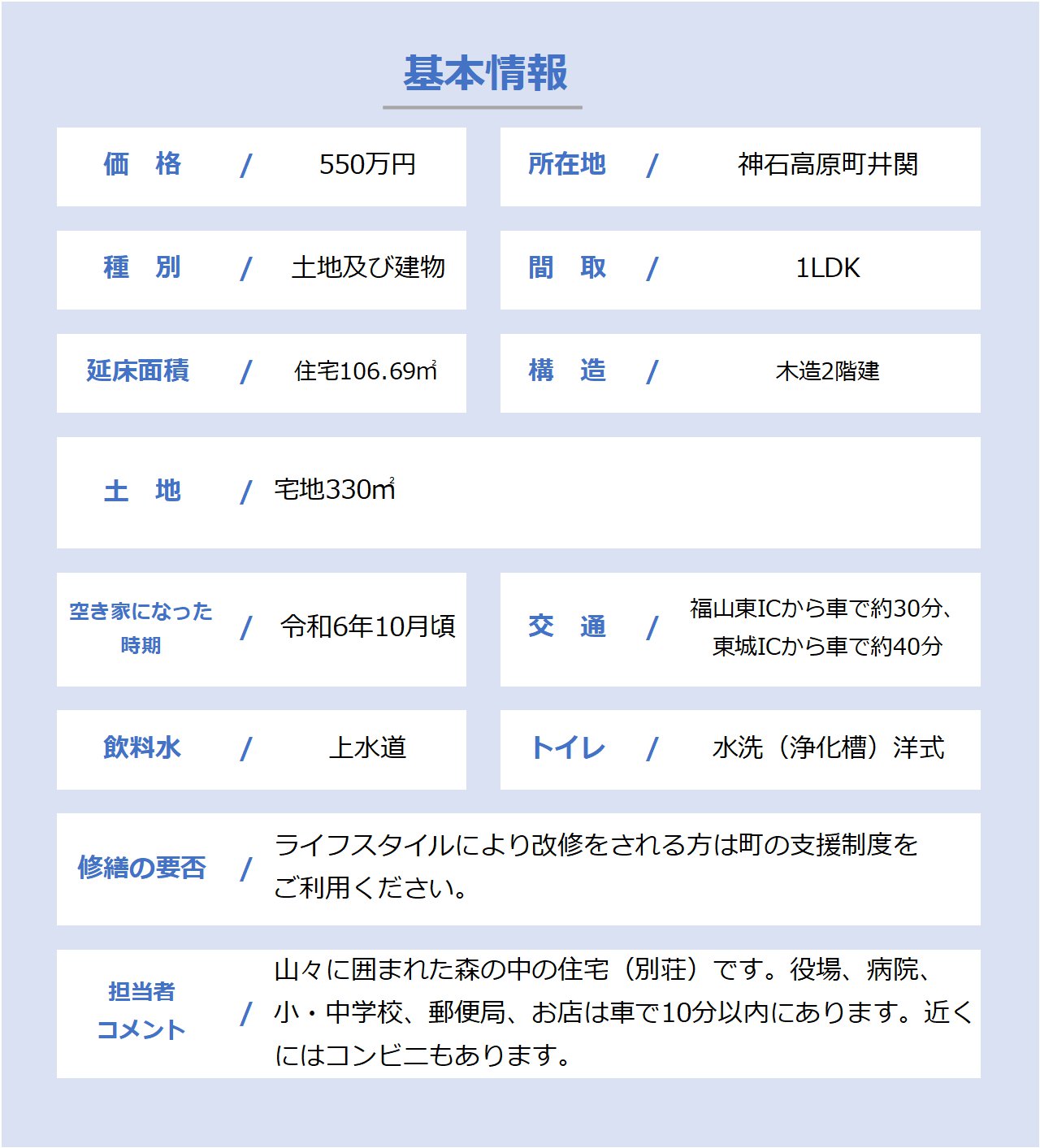 【所在地】広島県神石郡神石高原町井関 【種別】売却(土地及び建物)