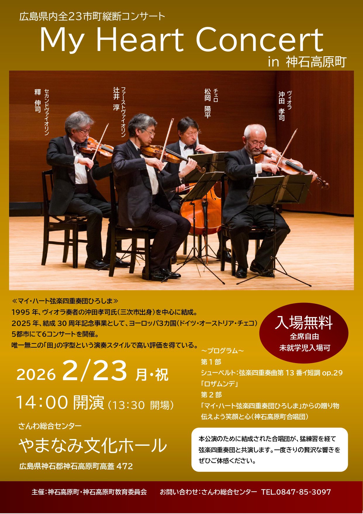 三次市出身のヴィオラ奏者、沖田孝司さんが中心となり結成された弦楽四重奏団による「マイ・ハート・コンサート in 神石高原町」を開催します。